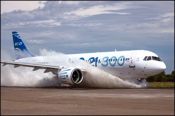 МС-21 пока проходит испытания.Посадка на полосе покрытой водой. фото: объединённая авиастроительная корпорация