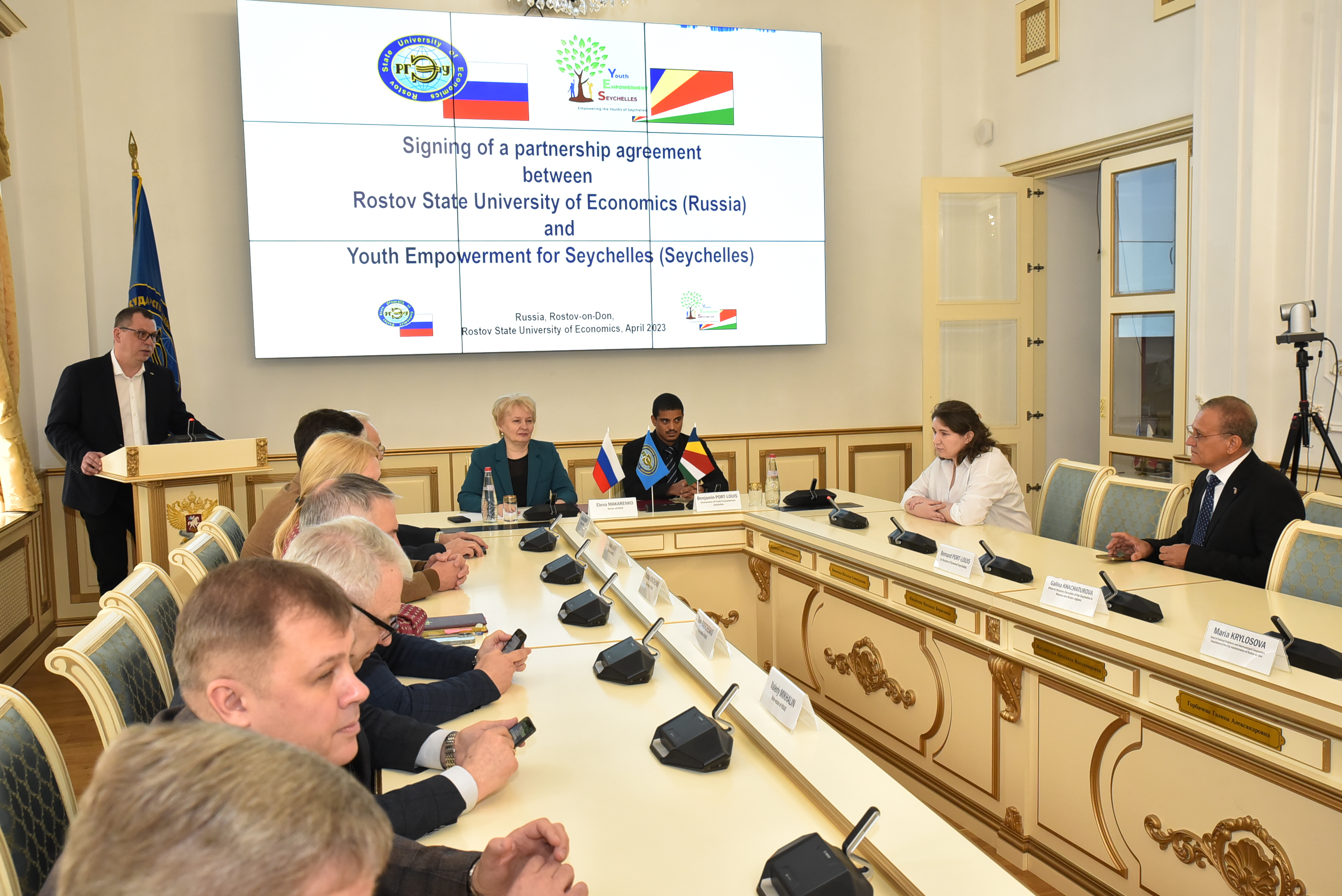 Подписание Соглашения о сотрудничества, разработанного на основе достигнутых предварительных договоренностей, ректором РГЭУ (РИНХ) Еленой Макаренко и председателем «Youth Empowerment Seychelles» Бенджамин Порт-Луи прошло в торжественной обстановке в зале заседания Ученого совета. В церемонии приняли участие представитель Почетного консульства Республики Сейшельские Острова в городе Москве, Московской области и Ростовской области Галина Хачатурова, начальник отдела внешних связей и межмуниципального сотрудничества Администрации города Ростова-на-Дону Мария Крылосова, а также ректорат Университета, деканы, руководители учебных и научных подразделений РГЭУ(РИНХ). В своем приветственном слове Елена Николаевна и другие выступающие подчеркнули важность и большой потенциал развития российско-сейшельских академических, научных, культурных и экономических связей и их успешность, несмотря на относительно короткий период их становления. Инициированные Почетным консулом Дмитрием Кисловым и Администрацией города Ростова-на-Дону они уже оформлены договором о побратимских связях между городом Ростовом-на-Дону и столицей Сейшел городом Викторией, целым рядам соглашений и инициатив в образовательной сфере, культурными и бизнес-проектами.