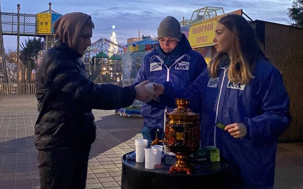 В парке им. города Плевен волонтеры предлагали прохожим заполнить анкету с вопросами о благоустройстве Советского района. А после «молодогвардейцы» угощали участников опроса горячим чаем.