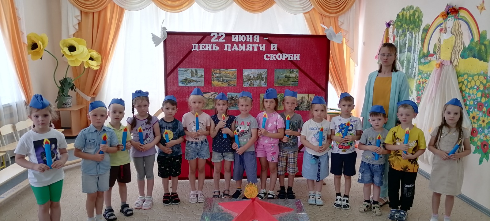 Утром, 22 июня, на площадке детского сада был проведен митинг и акция «Зажгите свечи» для всех возрастных групп детского сада, на котором педагоги и воспитанники почтили память минутой молчания всех павших в годы ВОВ. Затем воспитанники перешли в музыкальный зал, где просмотрели фильм о том, как началась ВОВ. Воспитанники ставили различные танцевальные инсценировки о том, как началась ВОВ. Ребята старшей группы исполнили флэш-моб «Встанем»! Затем ребята прошли испытания в эстафетах «Опасная разведка», «Помоги раненому». Воспитанники с большим интересом слушали песни военных лет, читали стихи о войне и мире.