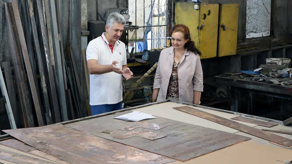 Параллельно предприятие «Юг-Художественная ковка» занимается изготовлением самого памятного знака. Для этого используются специальные медные листы. Вчера Инна Титаренко побывала на предприятии и обсудила с его руководителем Александром Гаркушей ход и сроки выполнения работ.