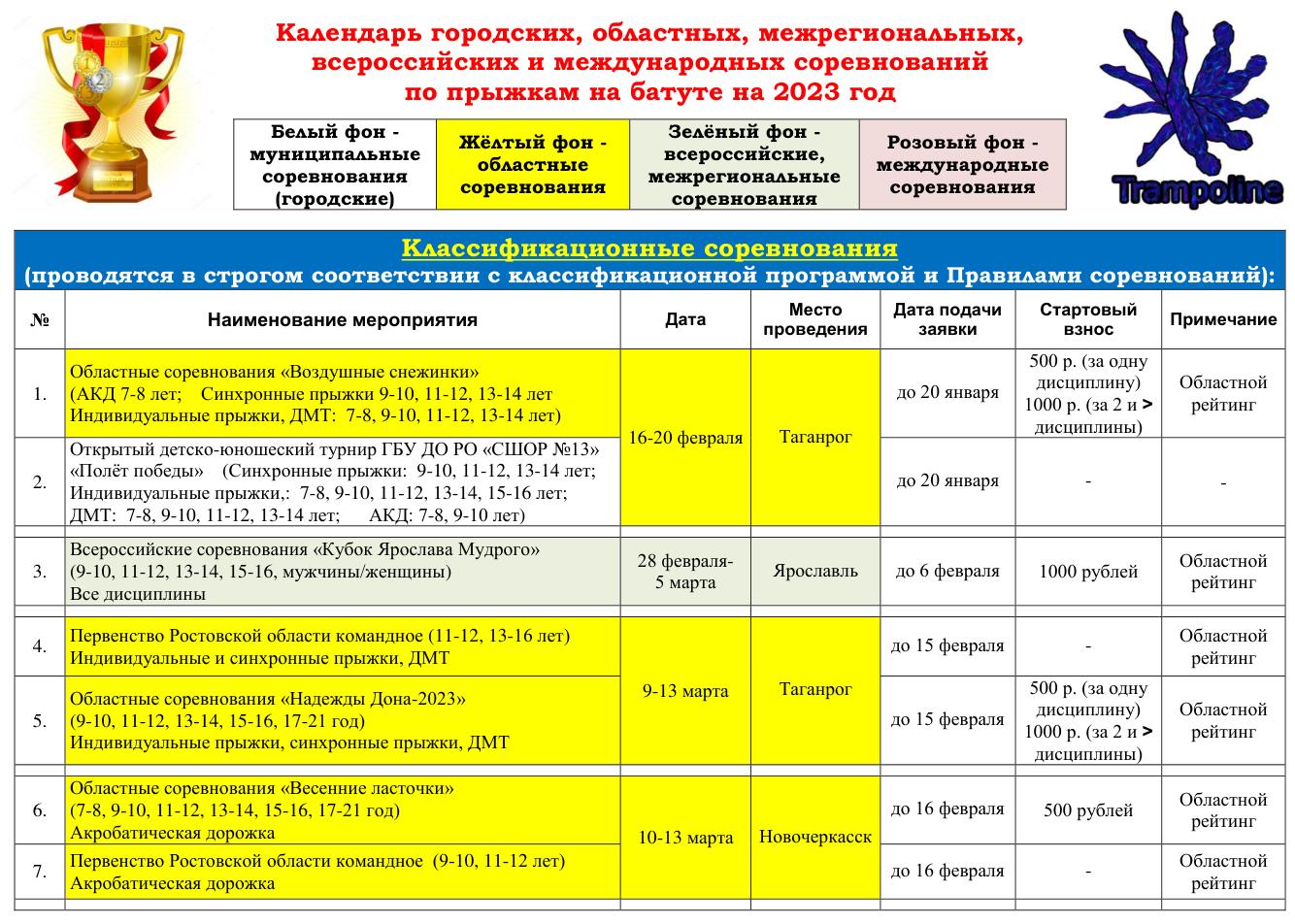 Календарь городских, областных, межрегиональных, всероссийских и международных соревнований по прыжкам на батуте на 2023 год