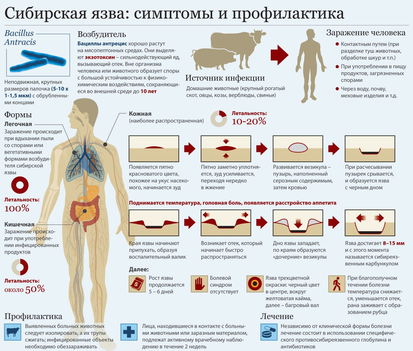 Человек может заразиться сибирской язвой, ухаживая за больным животным, при забое скота, разделке туши, соприкосновении с продуктами животноводства (шкурами, кожей, меховыми изделиями, шерстью, щетиной), обсемененными спорами возбудителя. Кроме того, заражение может произойти при вдыхании инфицированной пыли, костной муки, при употреблении в пищу сырого или недостаточно термически обработанного мяса зараженного животного или через укус насекомого (слепней, мух-жигалок, комаров). Еще один источник опасности – почва, а точнее – скотомогильники.