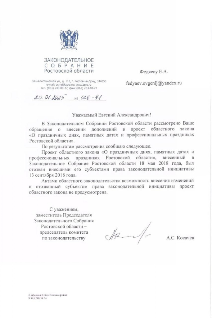 Руководитель правового центра, бывший депутат Заксобрания Ростовской области Евгений Федяев предложил в регионе ввести новый праздник 4 ноября под названием "День прекращения полномочий губернатора Ростовской области Вас