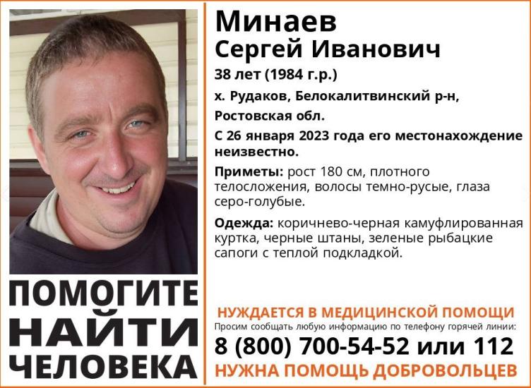 Ростовская область, 27 января 2023. DON24.RU. В хуторе Рудаков Белокалитвинского района без вести пропал 38-летний Сергей Минаев. Как сообщили в поисковом отряде «ЛизаАлерт», местонахождение его не известно с 26 января.
