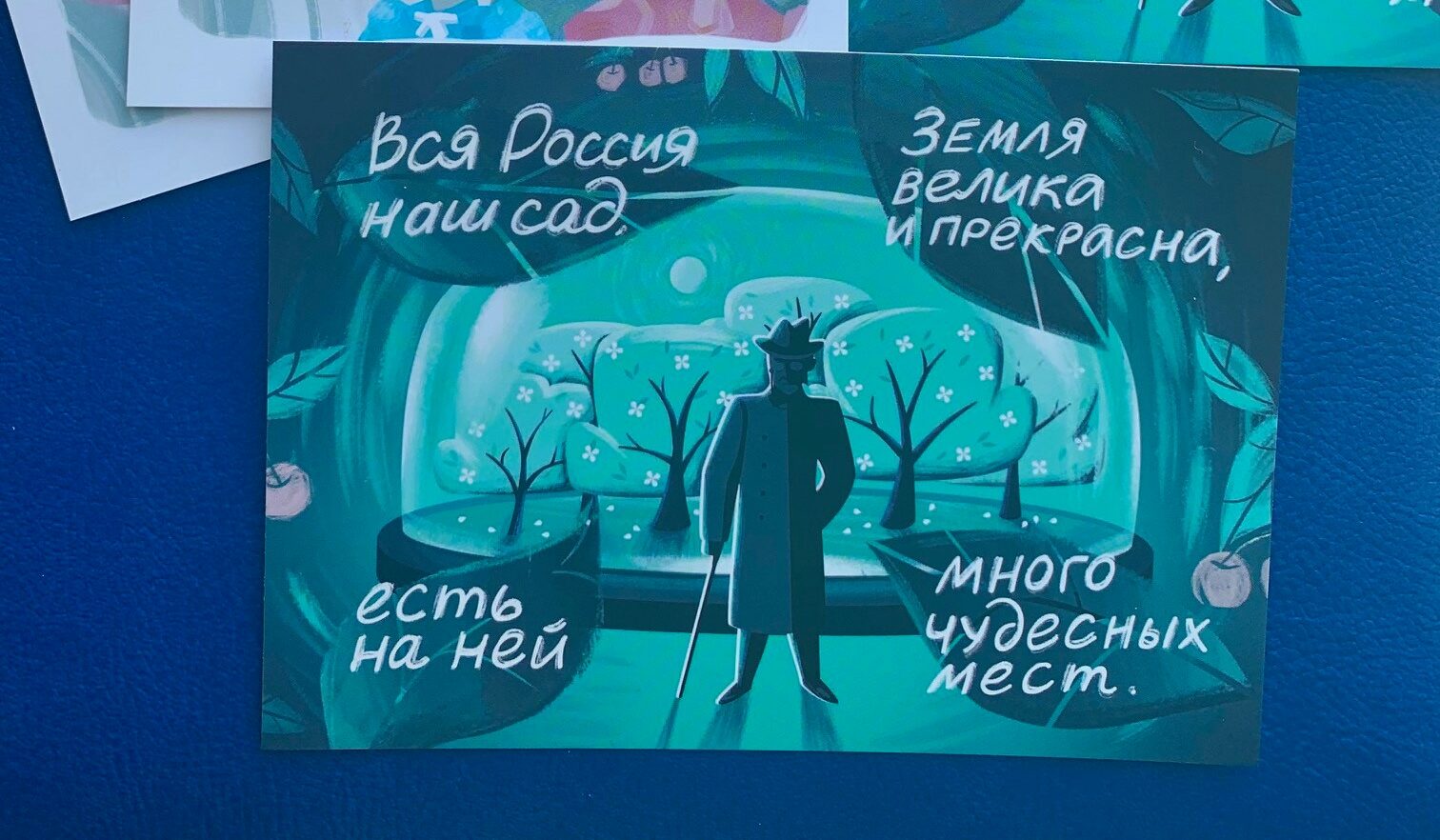 На одной открытке изображена иллюстрация на тему сразу нескольких произведений Антона Чехова («Три сестры», «Чайка» и «Вишнёвый сад»), а на второй –– сам писатель в вишнёвом саду. Почтовые карточки сопровождают цитаты Антона Чехова.