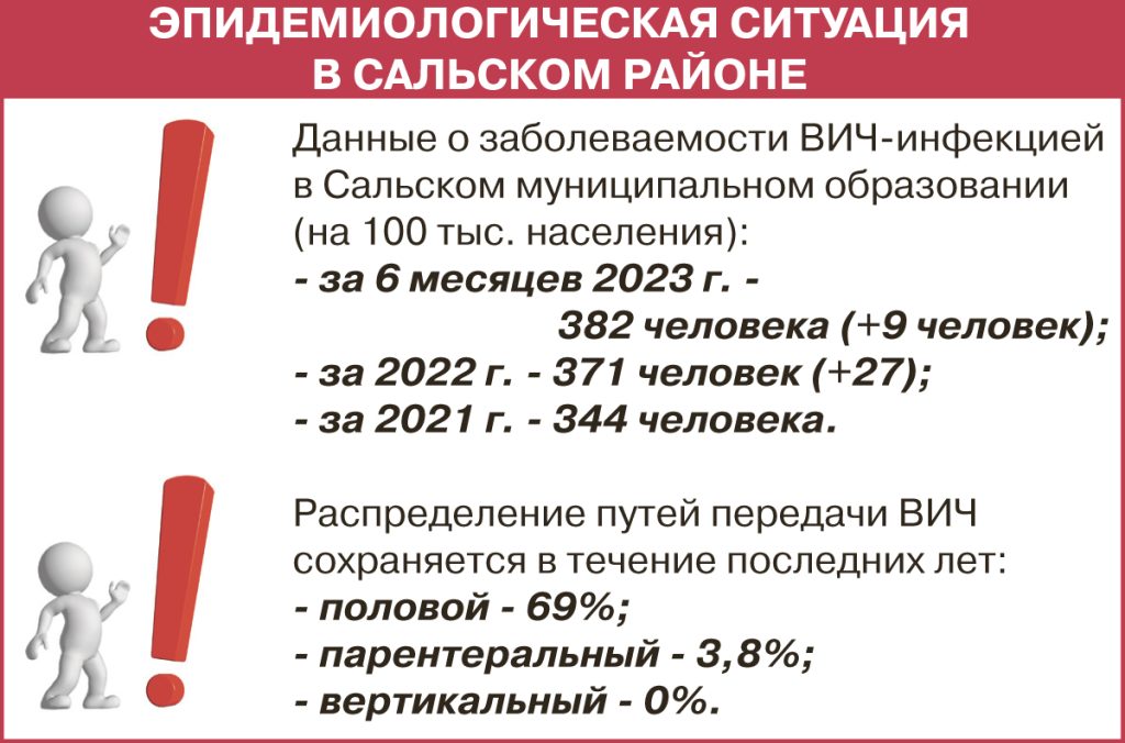 Ещё один путь передачи ВИЧ — ребенку от зараженной матери во время беременности, родов и кормления грудью. Но у современной медицины есть все возможности, чтобы предотвратить заражение малыша. Женщина получает трёхэтапную антиретровирусную терапию: во время беременности, находясь в родах и послеродовом периоде. Новорождённого переводят на искусственное вскармливание. Ребёнку также на определённое время назначают необходимые препараты, каждые полгода у него берут кровь на ВИЧ. Этими детьми занимаются специалисты областного СПИД-центра. Если всё в порядке, ребёнка в возрасте полутора лет могут снять с учёта, но, как правило, наблюдают и дольше. К счастью, в Сальском районе случаев передачи вируса от матери к новорождённому не было уже порядка десяти лет.