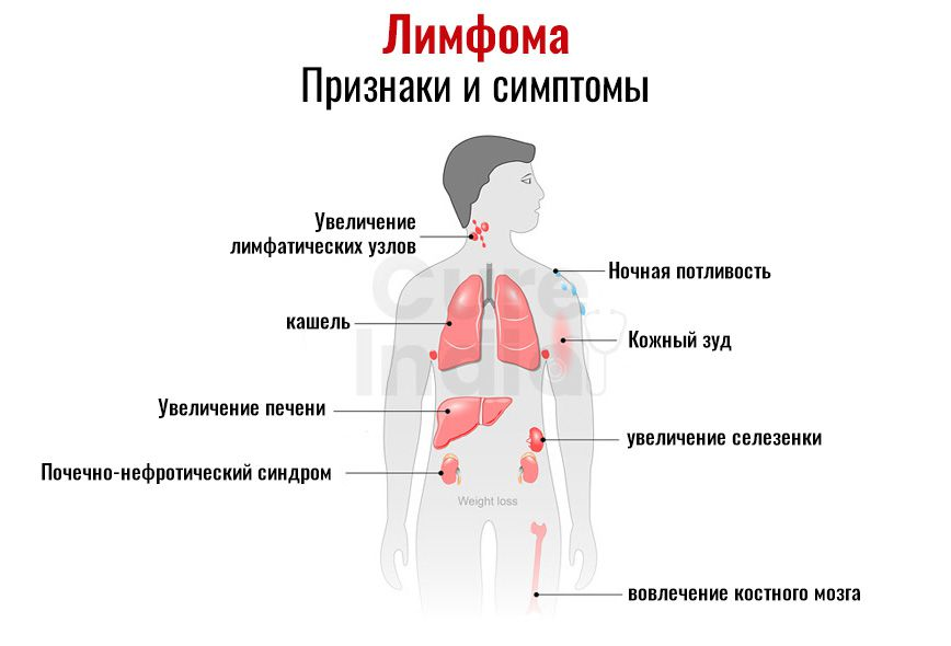 беспричинное увеличение лимфоузлов; кожный зуд до расчесов; лихорадка выше 38 °С не менее трех дней подряд без признаков воспаления; ночная потливость; похудение на 10% массы тела за последние шесть месяцев.При выявлении симптомов необходимо обратиться к врачу: терапевту, онкологу или гематологу.