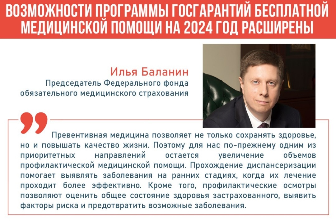«Превентивная медицина позволяет не только сохранять здоровье, но и повышать качество жизни. Поэтому для нас по-прежнему одним из приоритетных направлений остается увеличение объёмов профилактической медицинской помощи. Прохождение диспансеризации помогает выявлять заболевания на ранних стадиях, когда их лечение проходит более эффективно. Кроме того, профилактические осмотры позволяют оценить общее состояние здоровья застрахованного, выявить факторы риска и предотвратить возможные заболевания», – отметил Председатель ФОМС Илья Баланин.